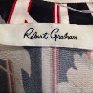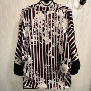 Chic Robert Graham blouse with floral and stripe pattern and sequin sleeve cuffs Features black, white and red design. Ideal for stylish outings. Sleeves have a bit of elastic cuff to create a bit of a poof at the end. Very lightweight and airy.