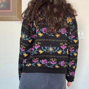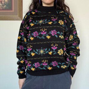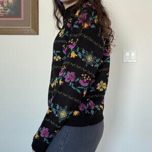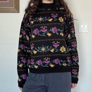 cozy floral sweater featuring black, magenta purple, yellow, teal, and green