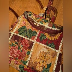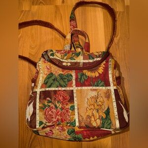 This elegant floral tapestry backpack features a vibrant mix of colors, perfect for adding a touch of style to any outfit. The intricate design showcases beautiful red, green, and yellow hues, making it a standout accessory.