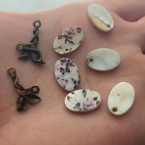 This floral themed set includes 12 perfect red rose shaped clay beads, these are beautiful and look so delicate but feel hardy. They are very light and have a drilled hole if you wish to use them as beads, though they could be simply glued as pretty embellishments as well. 6 GORGEOUS oval shaped, ivory coloured shell beads with pink purple flowers (I have a small amount of these left to work with, they are really feminine and just so pretty). A couple of metal findings with leaf theme, 13 glass painted beads and two leaf themed metal pendants with "bliss" and "inner peace" inscribed on them; I've made some nice stuff using those pendants and these are the last two of the bunch!