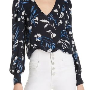 Elevate your style with this elegant floral V-neck blouse. Featuring a striking black and blue design, this top is perfect for any occasion. Pair it with your favorite jeans or skirt for a chic look.worn a few times.