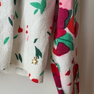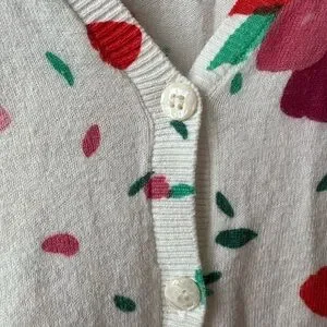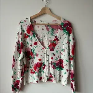 Stylish floral V-neck Des petits hauts cardigan with vibrant red and green patterns on a white base. Perfect for layering.