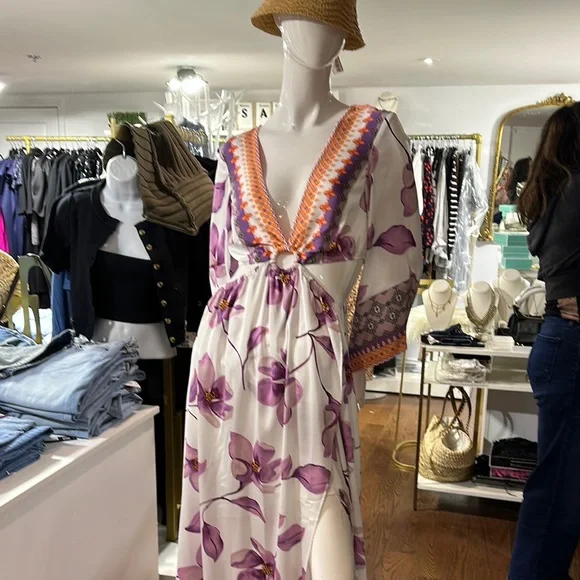 Embrace elegance with this stunning floral V-neck maxi dress. Featuring a beautiful purple floral pattern on a cream background, this dress is perfect for any occasion. The intricate design adds a touch of sophistication to your wardrobe.
