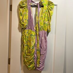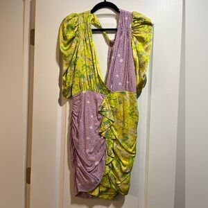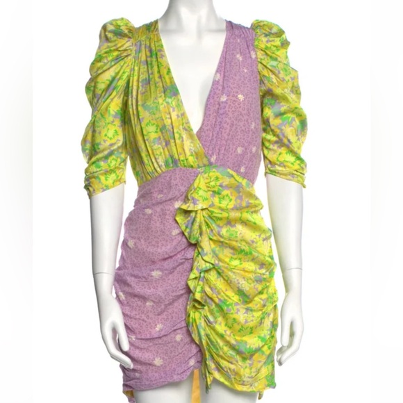 Embrace elegance with this vibrant floral dress. Featuring a V-neck and ruched detailing, it's perfect for any occasion. The mix of purple and yellow adds a lively touch to your wardrobe.