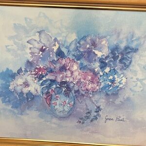 Enhance your home with this beautiful floral watercolor art. The piece features a blend of blue and purple hues, elegantly framed in a natural wood Perfect for adding a touch of color and sophistication for serving.