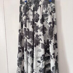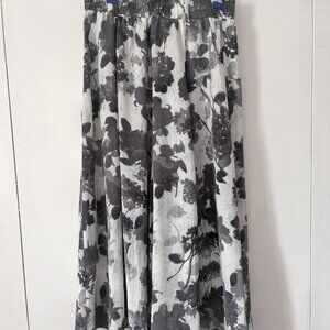 Elastic wide band, drapery glowy fabric. Wide-leg fitting, all the features comes into this summer pants. Print in grey florals.
