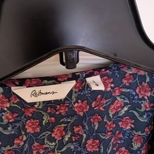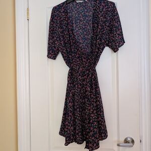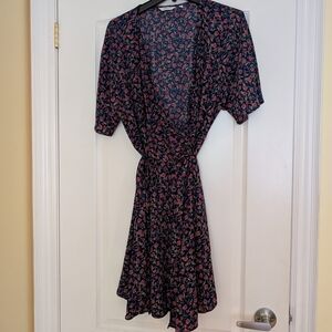 Elegant floral wrap dress featuring a navy base with pink accents. Perfect for any occasion.