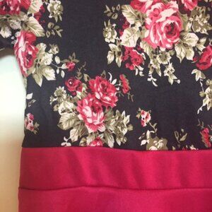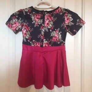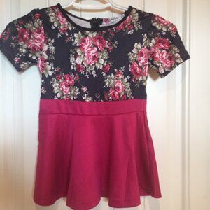 Pretty floral dress, with back zip. Stretch silky fabric. Brand : Vogue Fashion. Fabric : Polyester/nylon jersey. Color : Black floral print and fuchsia. Size : 2-3.