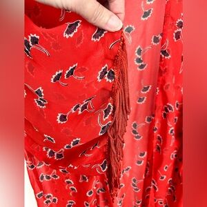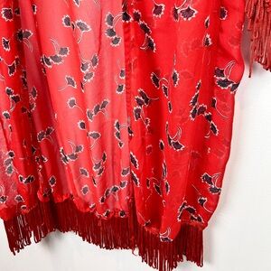 Floral kimono pool beach coverup, Med, red fringe lightweight sheer long sleeves