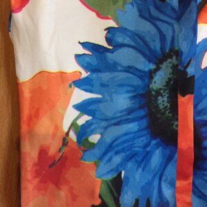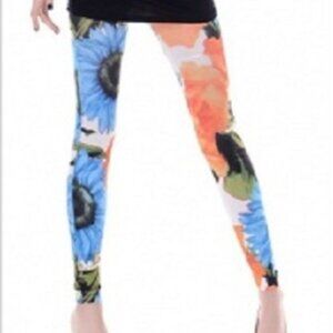 Floral stretch leggings in vibrant colors. Brand : Unknown. Fabric: stretch mixed fibers. Color : Black, orange and blue floral print. Size : S.