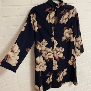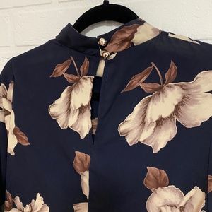 Deep navy blue color with beige/brown florals. High neck and long sleeve.