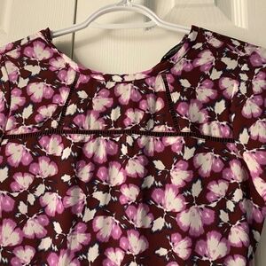 Beautiful purple floral dress with small eyelet cut outs below the neckline.