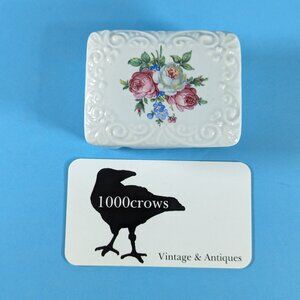A sweet little white porcelain lidded box, the lid with a peonies flower pattern, the edges with a floral / scrollwork relief in the porcelain. In good condition without chips of cracks. Great for a few little pieces or jewellery or candies