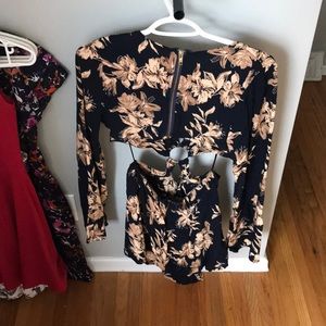 Floral romper type outfit with shorts. Mid length sleeves, and zippers up in the back on both the shorts and top. Has breast padding built in.