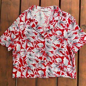 Red and white floral button-up blouse