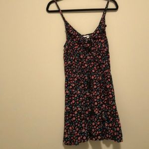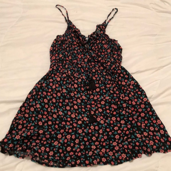 Black wrap / ruffly spaghetti strap dress with pink floral details