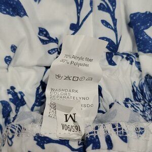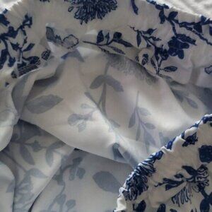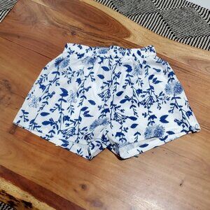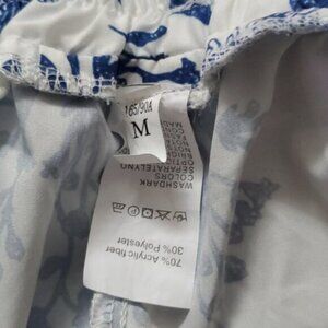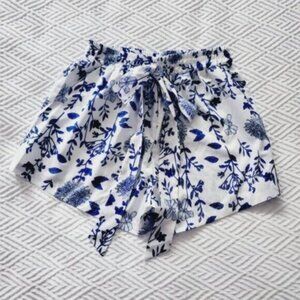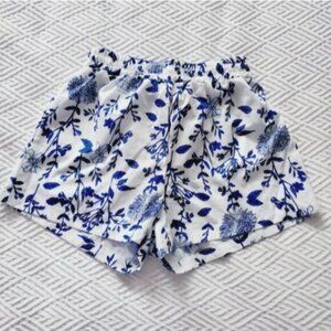 A beautiful rare pair of Mediterranean tones of blue and white with floral design. Fixed sash. Elastic waist. Bermuda style. Light and airy. New without tags.