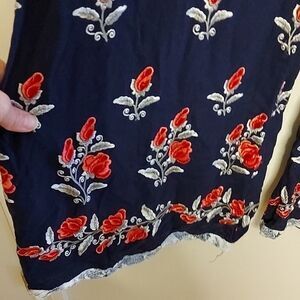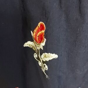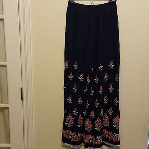 These wide leg pants are so beautiful. Embroidered with roses in bloom moving elegantly down the leg. In very good used condition.