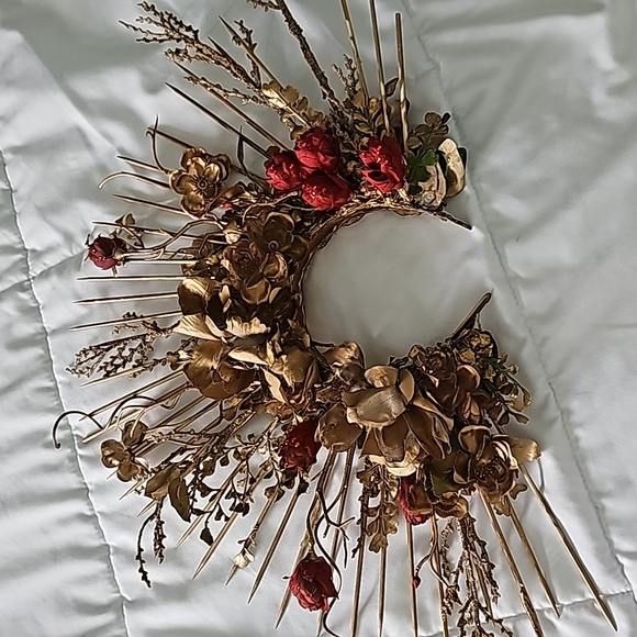 Hand-crafted flower crown with golden branches and bedazzled red rose buds. Make a statement at your next photoshoot with this fierce custom-made floral headdress!
