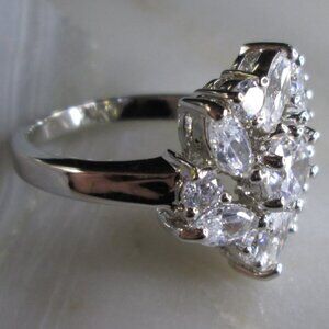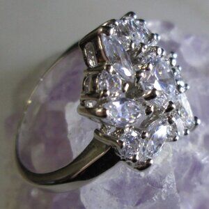 Clear Flower Cubic Zirconia cocktail ring. Silver plated metal alloy. Simulates Diamonds. Purchased 2008 and unworn.