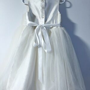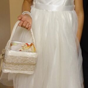 Beautiful white dress. Makes the perfect flower girl dress. Size 5. From David’s Bridal. In excellent condition. Worn once. No stains and nonsmoking house.