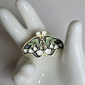 New metal black & gold butterfly moth enamel pin w/ white flowers & green leaves