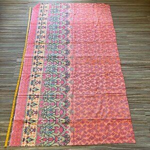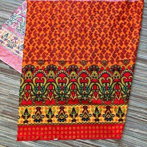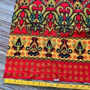 Vintage fabric yardage in a bright & bold border print design in red, orange & green colors. Unused cut fabric yardage: Long edges have one selvedge edge and one cut edge; short edges are both cut ends. Approx. 40" x 66". Feels like cotton or a cotton blend, fabric weave has a subtle texture. Weight of the fabric yardage is approx. 325gr.