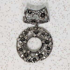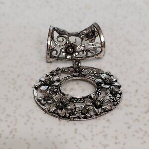 Silver Toned Rhinestone Scarf pendant In a jewelled antiqued look style. Just under 4 inches in length and 2 1/2 inches wide. Gorgeous scarf gather can be used as other decorative piece in wardrobe, rather versatile. Very excellent preloved condition.