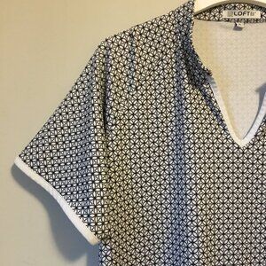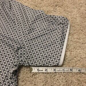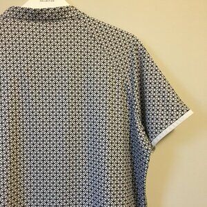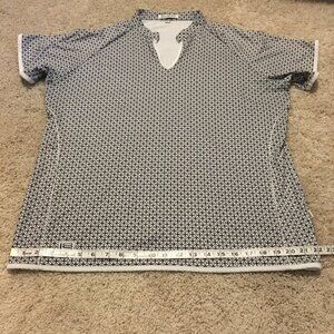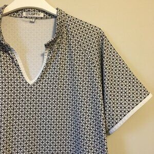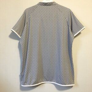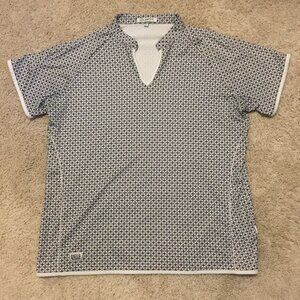 Very good preowned condition white and black flower of life pattern, poly flex, tunic neck style shirt with white trim by Loft8. Nicely sewn and great structure and fit. I believe this is a men's brand, but it could be unisex.