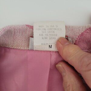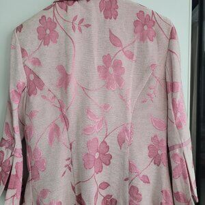 Flowy spring jacket-vintage style vintage material; 3 buttons front, fabric covered; two functional pocket adorned with bow and ribbon; slight yellowing around neck line; partially lined; 56% rayon, 44% polyester