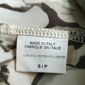 I lost the brand tag but it was made in Italy. Size S but could maybe fit a Medium as well. Shades of brown, taupe, beige and some navy blue. Low turtleneck with a button in the back. NEVER WORN