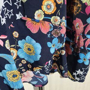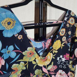 Beautiful, unique floral / navy knee-length dress. Flowing cap sleeves and hemline, hemline is slightly high-low and has a cross detail at front. Round neckline on front, v-neckline on back with cross strap. Side zipper closure. Note, this dress fits slightly small, closer to a large than an XL.
