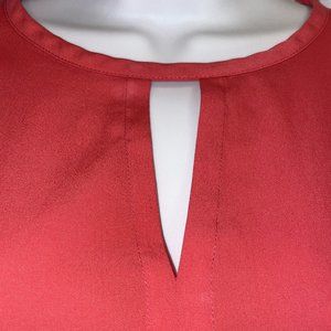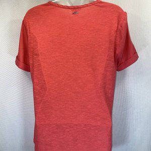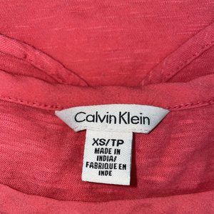 This coral colored Calvin Klein short sleeve top is perfect for summer. There are 2 different fabrics. The front is a 100% polyester and the back is a 60/40 cotton/modal blend. It is a extra small but has been cut to be flowy so could fit as a small.