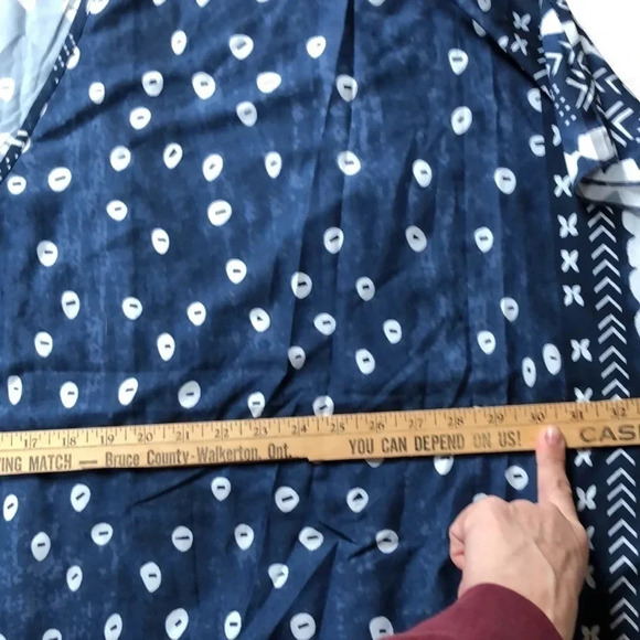 Dress with blue background and various shapes in white. Very beachy and summery!