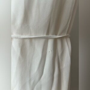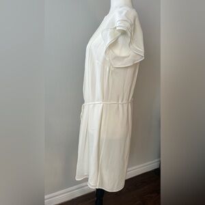 V-neck, knee length dress in flowy chiffon with cap sleeve. Button at front and elastication at back of waist. Attached tie belt and satin lining.