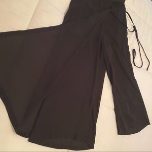 Super cute black flowy pants/skirt. It has an elastic belt around the waist and it also wraps on the side like a skirt. Very flowy and flattering. Polyester