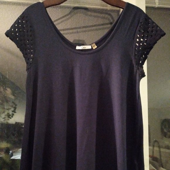 Flowy top. The detail is in the sleeves. Can be worn as a tunic on a shorter person. Great to put over leggings or jeans.