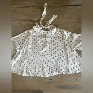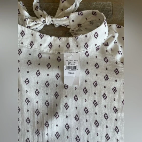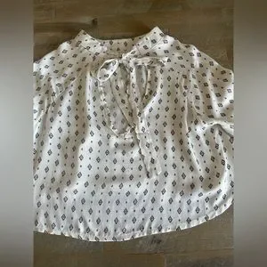 High neckline with bow at the top of the back of the top. The sleeves have have flowy ruffles and the back has an open piece along the top! Never worn!