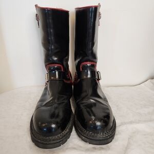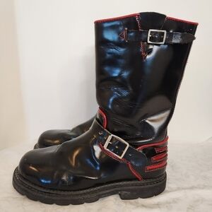 Shiny Black & Red Patent Leather Steel Toe Moto Biker Boots with Silver Buckles on the calves and ankles, 'Safety Vogs' by JOHN FLUEVOG.