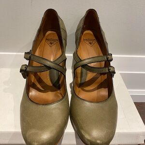 These are John Fluevog cross-strap shoes (from the Miracles family; Hollie style) in military green leather, size 9.5 womens and fit true to size but probably not great for a wider foot. I bought them in 2012 for $245 and love them to bits but have only worn them about 5 times. It's time for someone else to give them the love they deserve. They are in very good condition but there are some scuffs (visible in photos) on toes and heels that I assume would come out with a polish.