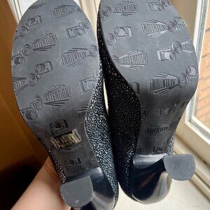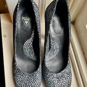 Discontinued style from 2010, only worn a couple times. Excellent quality and design, reminiscent of a 1940s shoe but the engineering is modern and truly as comfortable as a 4 inch heeled shoe could possibly be. Textured leather replicates the skin of a Manta Ray. "Hidden" platform interior gives you padded soles, easy to walk in.