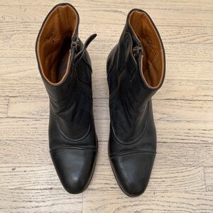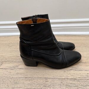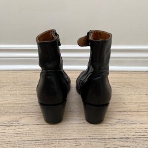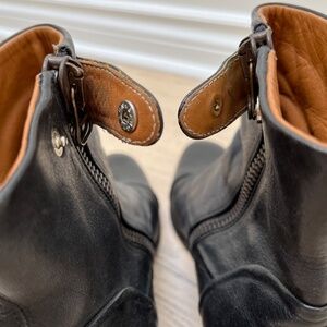 Fluevog Passage Preet boot in black leather, women's size 9. Great worn in condition. Super comfortable boot. One part of the snap button on one foot is broken, but doesn't affect the wear. Can be fixed super easily and cheaply. (Images shown)
