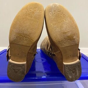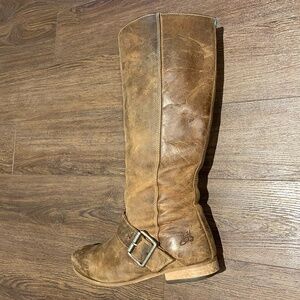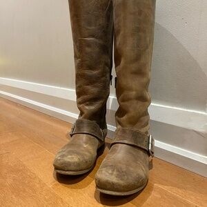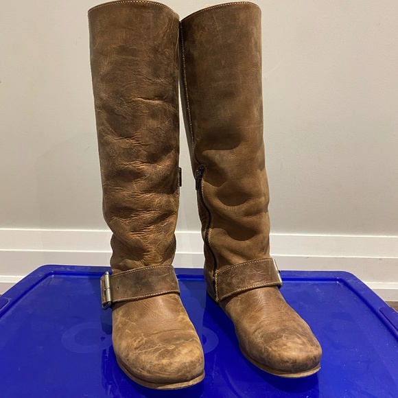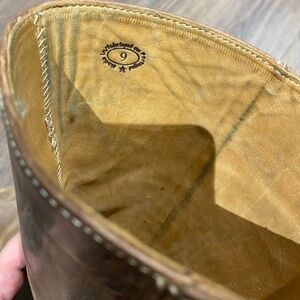 These Fluevog boots are brown leather with an inside zipper (only partial height of boot; see photos). They are a size 9 and fit true to size but do have a narrow toe box. They have been much loved but have a lot of life left in them. There are scuffs and tone variations but that is the nature of this particular leather... definitely intended to have a rustic vibe.