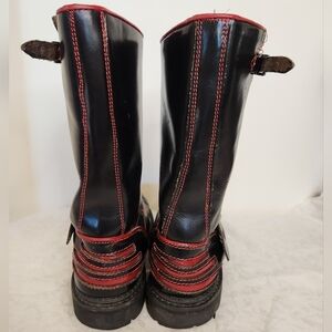 Shiny black & red patent leather steel toe moto biker boots with silver buckles on the calves and ankles, 'Safety Vogs' by John Fluevog.