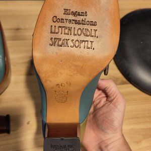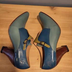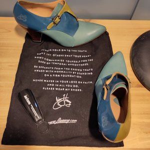 John Fluevog almost mint condition Glenham - blue & green heeled monkstrap shoe.