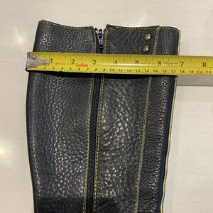 These boots are amazing. The leather is very soft and supple and the there are 3 green/yellow seams/stripes up the front of each boot which add interest and detail without being "too busy". While the size is US 10, they fit small and are better suited to a US 9 foot. There is wear in the heel treads but I am including a set of replacement heel treads (see photos).