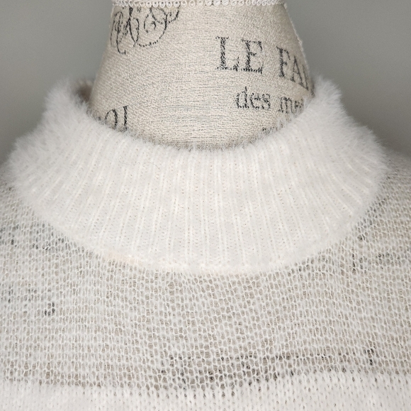 Long Fuzzy White Eyelash Knit Mock Neck Long sleeve Pullover Jumper Sweater with semi sheer Stripes and Ribbed trim, by UME Studios.