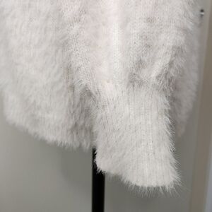 Long Fuzzy White Eyelash Knit Mock Neck Long sleeve Pullover Jumper Sweater with semi sheer Stripes and Ribbed trim, by UME Studios.