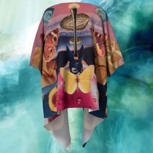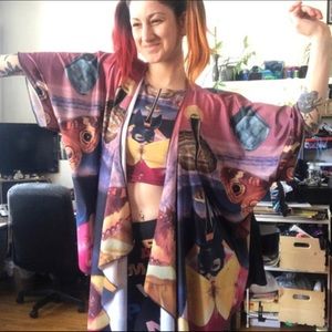 ‘Fluttery Drips’ design printed on a draped robe made of silky stretchy knit. This original artwork is a paper collage. The original is actually still available if you go to my Etsy store you’ll find it there! :) This robe is a size large/x large