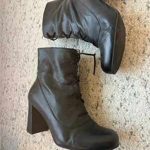 Fly London 9.5 EUC rounded toe lace up front kinda almost victiorian vine.:: laces look great ask the best part is it’s a side zipper!!! So so so so so nice!!! black leather boots with a stylish lace-up design. Perfect for elevating any outfit.